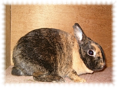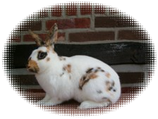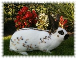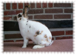 De kettingstippen waren echter minimaal , aan 1 zijde helemaal geen kettingstippen, en de stippen waren erg grof van formaat en stonden niet los van elkaar. Ik was over het resultaat van dit eerste nest zeer tevreden. De jongen groeiden voorspoedig op .Van de 3 getekende jongen bleef er 1 aanmerkelijk kleiner, dit was een rammetje . Toen deze volwassen was had hij een gewicht van slechts 1800 gram, terwijl de andere 2 getekende dieren 800 gram zwaarder waren en de oren ook 2 centimeter langer hadden.
